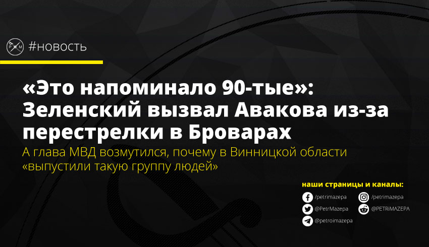 Президент Украины Владимир Зеленский вызвал и заслушал министра внутренних дел Арсена Авакова из-за перестрелки в Броварах. Глава государства потребовал провести расследование и найти виновных, а глава МВД пообещал «сделать кадровые выводы» касательно Винницкой области, откуда «выпустили такую группу людей, хотя бы и с охотничьим оружием».