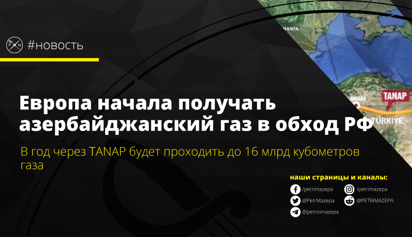 Государственная нефтяная компания Азербайджана SOCAR сообщила о том, что их газ достиг Европы в обход РФ. На первом этапе функционирования Трансанатолийского трубопровода (TANAP) через него будет проходить 16 млрд кубометров газа в год.