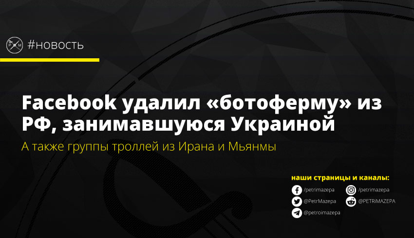 Facebook удалил сеть аккаунтов из России, Ирана и Мьянмы за нарушение правил об иностранном вмешательстве. «Боты» из РФ были ориентированы на Украину, выдавали себя за наших сограждан, и распространяли контент об украинской политике, малазийском «Боинге», ситуации в Крыму и Сирии.