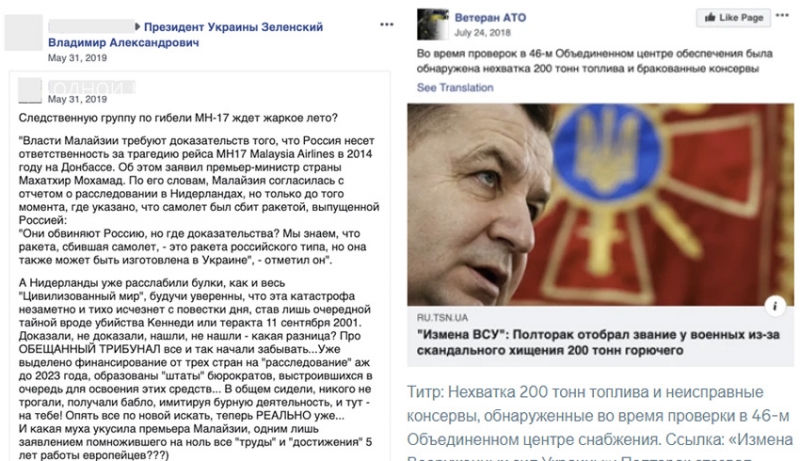 Об этом сообщает отдел политики безопасности Facebook. Всего было удалено 78 учетных записей, 11 страниц, 29 групп и 4 аккаунта в Instagram. Соцсеть сообщает, что стоявшие за деятельностью этой «ботофермы» люди пытались выдавать эти аккаунты за принадлежащие украинцам, а некоторые даже пытались выдавая ботов за журналистов связаться с нашими политиками, журналистами, общественными деятелями. Основной темой «ботофермы» была украинская политика, включая наших общественных деятелей, «утечки из СБУ», ситуация в Крыму, сбитый россиянами рейс MH-17 и военные действия РФ в Сирии. Среди представленных Facebook скриншотов – посты в группе «президент Украины Зеленский» об MH-17, и аккаунт «ветеран АТО», распространявший информацию о «хищениях в ВСУ».