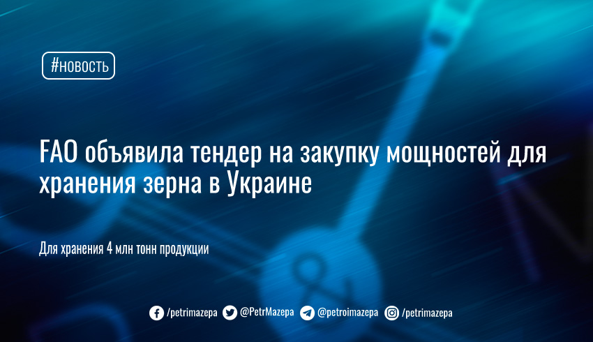 Продовольственная и сельскохозяйственная организация ООН (ФАО) объявила международный тендер на закупку мощностей для хранения 4 млн тонн украинского зерна. Отмечается, что в рамках тендера будут закуплены рукава для хранения зерна, погрузчики и разгрузчики зерна, а также модульные зернохранилища с тентовым покрытием и емкостью от 300 до 1 000 тонн (для пшеницы).