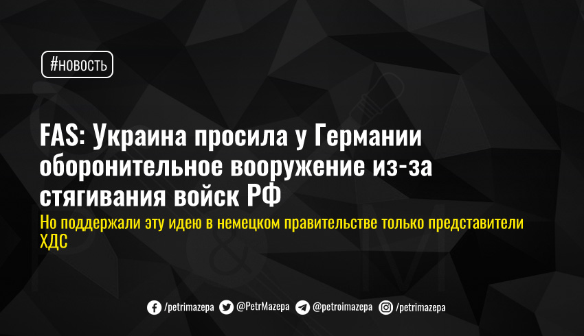Немецкое издание Frankfurter Allgemeine Sonntagszeitung (FAS) сообщило, что на фоне стягивания российских войск к границам Украины и в оккупированный Крым, Киев просил у Берлина оборонительное вооружение и оборудование для разминирования. Но просьба не нашла отклика в МИД Германии.