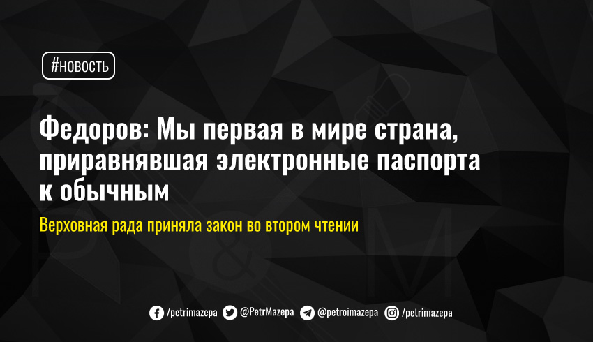 В своем Telegram-аккаунте Федоров сообщил, что в «в плане на день Верховной рады стоит голосование за закон про приравнивание электронных паспортов к бумажным/ID-паспорту (второе и последнее чтение). Если его примут, то на уровне закона мы забетонируем электронные паспорта и станем первой страной в мире с подобным опытом». А позднее добавил, что закон принят 302 голосами.