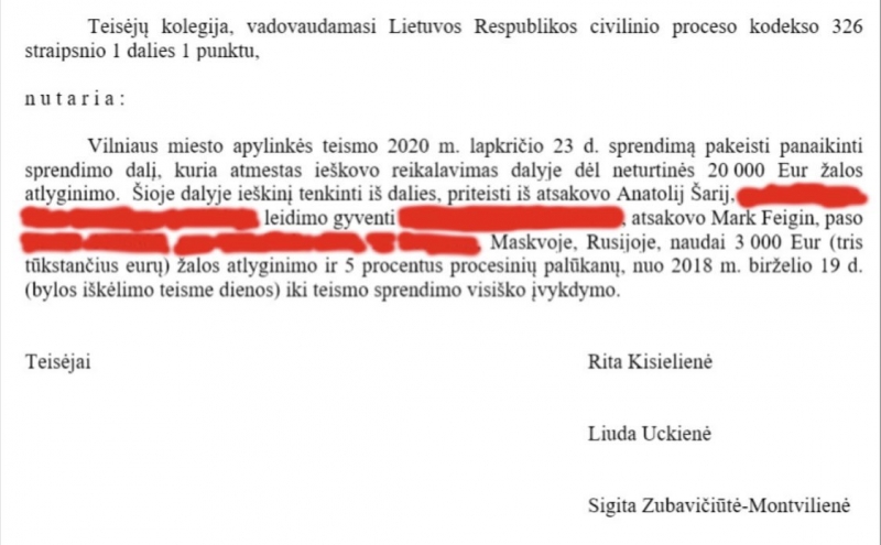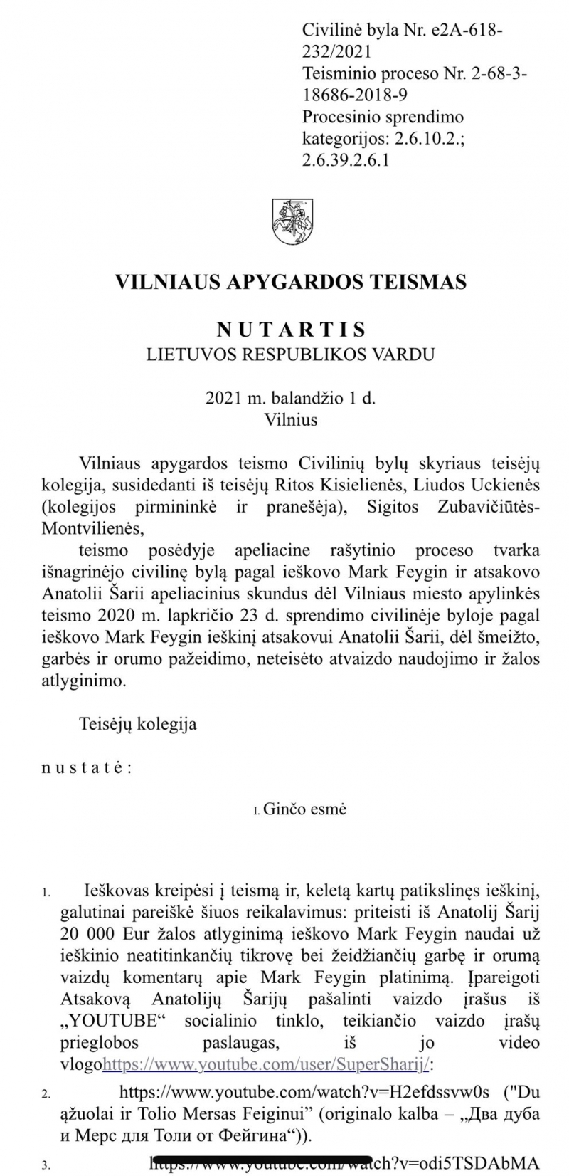 В качестве подтверждения своих слов Фейгин выложил часть Приказа Вильнюсского окружного суда. Всего в решении 43 страницы.