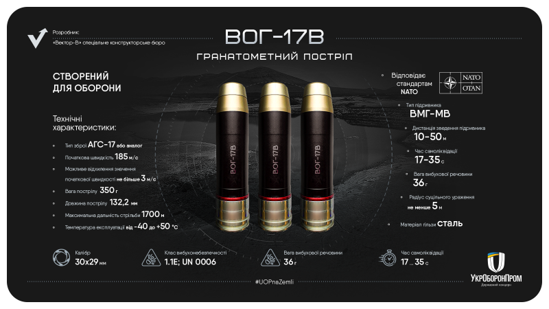 «На входящем в состав Укроборонпрома Шосткинском заводе "Импульс" развернуто первое в истории независимой Украины серийное производство боеприпасов для подствольных и автоматических гранатометов. Это явилось результатом плодотворного государственно-частного партнерства с ООО "Специальное конструкторское бюро "Вектор-В", которому принадлежит разработка этого боеприпаса», - сообщает пресс-служба «Укроборонпрома».