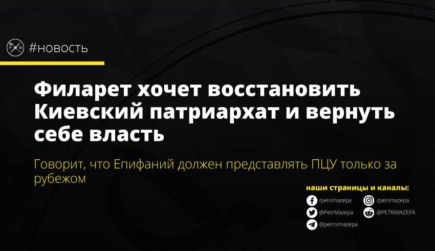Почетный патриарх Православной церкви Украины (ПЦУ) Филарет дал пресс-конференцию, на которой рассказал о вроде бы имевших место договоренностях между ним, Епифанием и Петром Порошенко. Согласно версии Филарета, вся власть над церковью в пределах Украины должна остаться в его руках, а Епифанию была отведена роль только представительства ПЦУ за рубежом. Но сейчас ему не дают править и поэтому Филарет готов восстановить Киевский Патриархат.