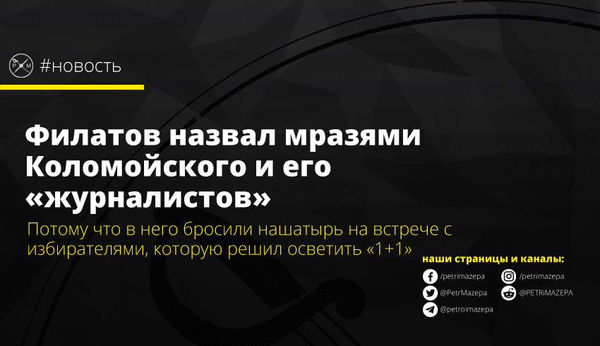 «Только что на встрече в Чечеловском районе, во дворе на ул. Строителей, 18 в меня бросили нашатырь. Все это происходило под камеры «1+1», которые «случайно» первый раз решили посетить мою встречу с избирателями. Коломойский - ты мразь. И твои «журналисты» тоже», - написал Филатов в Facebook.