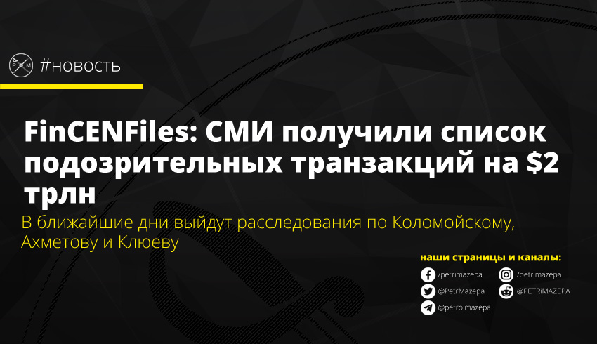20 сентября BuzzfeedNews обнародовало результаты двухлетнего исследования банковских отчетов. Утечка данных показала, что некоторые крупнейшие банки в мире вели бизнес с клиентами, которых они подозревали в коррупции, и позволяли преступникам перемещать «грязные» деньги по всему миру. Украинские олигархи стали фигурантами двухлетнего исследования банковских отчетов, включающих транзакции на 2 трлн долл. Журналисты обещают выкладывать свои расследования по итогам документов FinCEN в течение ближайших дней.