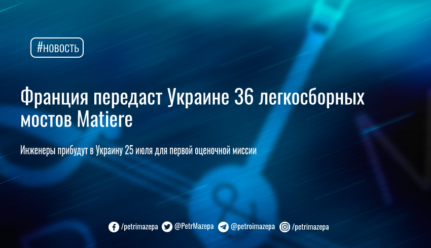 Французская компания Matiere передаст Украине 36 легкосборных мостов. Инженеры Matiere прибудут в Украину 25 июля для первой оценочной миссии.