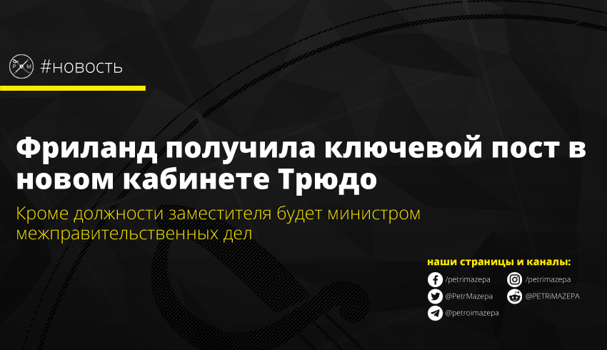 Премьер-министр Канады Джастин Трюдо представил новый состав Кабинета министров. Заместителем премьера стала бывшая министр иностранных дел Христя Фриланд. Она, кроме должности заместителя, также будет министром межправительственных дел.