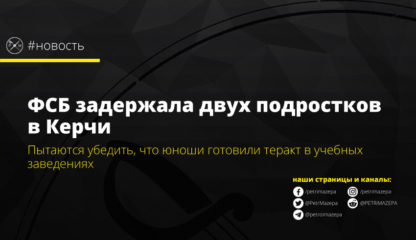 На оккупированном полуострове Крым сотрудники ФСБ России задержали двоих несовершеннолетних местных жителей (2003 и 2004 г.р.) по подозрению в якобы подготовке теракта. Пытаются доказать, что юноши придерживаются тех же взглядов, которыми российские СМИ наделили «керченского стрелка».