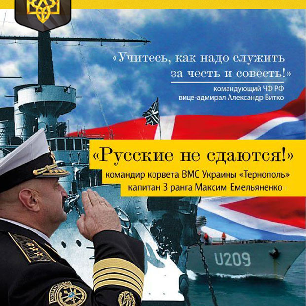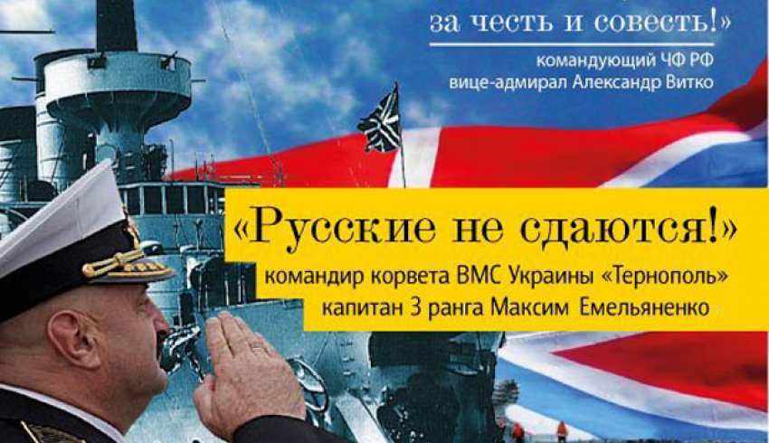 Ультиматум экипажу корабля с требованием немедленно сдаваться российским войскам ставил лично командующий ЧФ РФ вице-адмирал Александр Витко. На что командир корвета ВМС Украины «Тернополь» капитан 3 ранга Максима Емельяненко ему ответил «Русские не сдаются!».