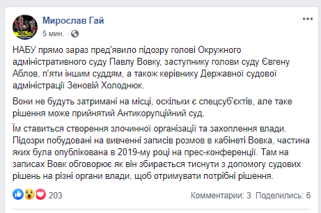 Волонтер и ветеран АТО Мирослав Гай сообщает, что сейчас НАБУ вручило ряд подозрений судьям Окружного административного суда Киева (ОАСК), а также – чиновнику Государственной судебной администрации.