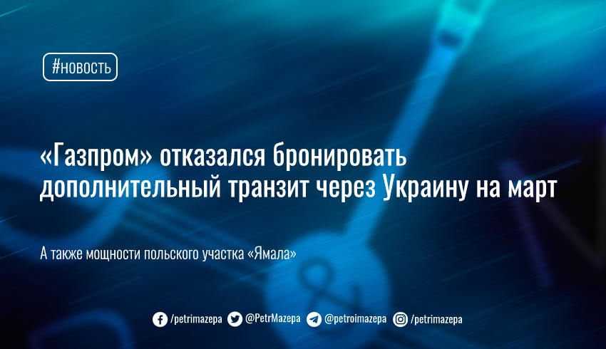 Российский «Газпром» не забронировал на март дополнительную транзитную мощность через Украину, а также мощности польского участка газопровода «Ямал».