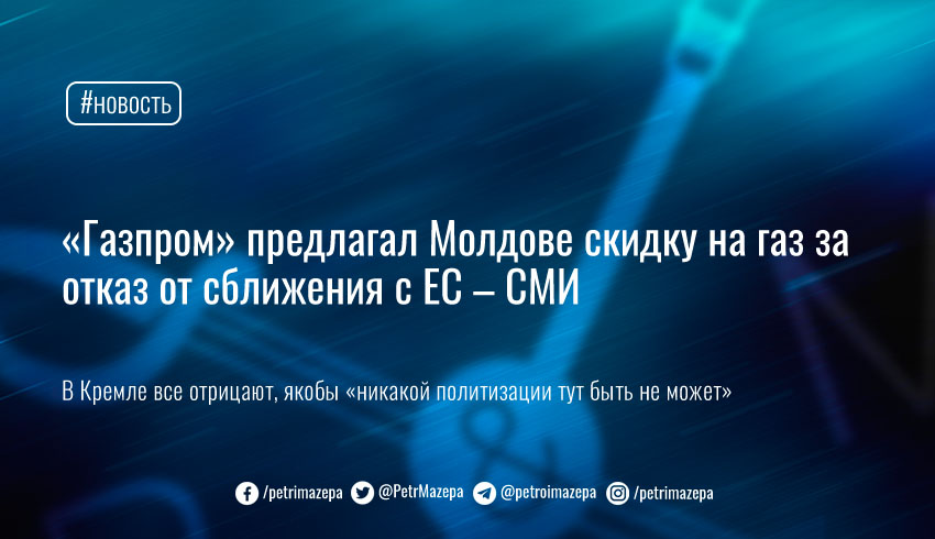 Российский «Газпром» предлагал Молдове скидку на газ, если страна откажется от сближения с ЕС и отсрочит реформу энергорынка, сообщили СМИ. В Кремле конечно все отрицают, заявляя, что это коммерческий, а не политический вопрос.