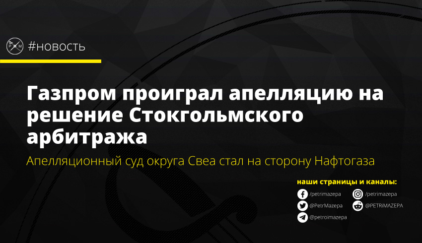Исполнительный директор НАК «Нафтогаз України» Юрий Витренко сообщил, что сегодня Апелляционный суд округа Свеа стал на сторону НАК и отклонил жалобу «Газпрома» на решение Стокгольмского арбитража.