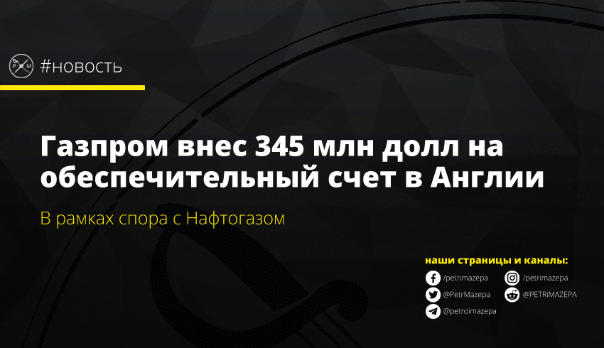 Российский монополист «Газпром» внес обеспечительные платежи в размере 345 млн долл на счет Высокого суда правосудия Англии и Уэльса в рамках судебного спора с НАК «Нафтогаз України» в Стокгольмском арбитраже.
