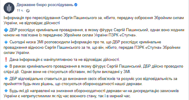 «Информация о преследовании Сергея Пашинского за якобы передачу вооружения Вооруженным силам Украины не соответствует действительности. ГБР расследует уголовное производство, в котором фигурирует Сергей Пашинский, однако оно никак не связано с передачей Вооруженным силам Украины ПЗРК "Стугна"», - сообщает пресс-служба Бюро.