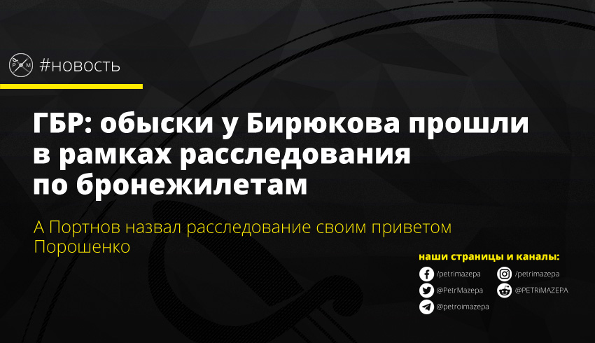 Сегодня на брифинге руководство ГБР рассказало о массовых обысках, которые были проведены по местам проживания должностных лиц Министерства обороны Украины. Данные действия проводятся в рамках расследования дела о хищениях при закупке бронежилетов. А вернувшийся недавно в Украину экс-заместитель главы АП времен Януковича Андрей Портнов намекнул, что это он причастен к обыскам у Бирюкова.