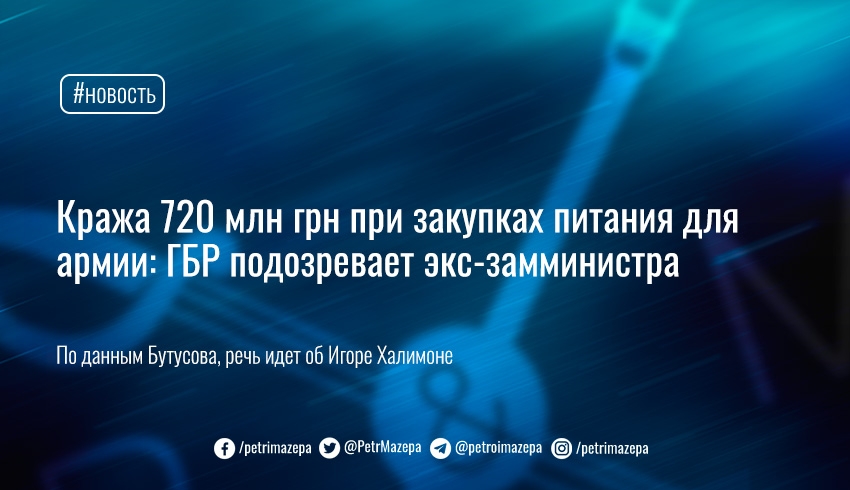 «...ГБР обнаружило создание системы преференций со стороны Халимона в интересах двух коммерческих компаний - „Ресурс Сервіс КМ“ и „Військсервіс-Волонтер“. В девять соглашений о закупках в декабре 2020 г.- январе 2021 г. были внесены заведомо невыгодные положения - в том числе, ограничение возможностей ведения претензионной работы заказчиком (Минобороны) в случае поставки некачественной продукции. Договора, по сути, менялись путем заключения дополнительных соглашений, и государство понесло ущерб в результате незаконного изменения Халимоном порядка восполнения неприкосновенных запасов», - указывает Бутусов.