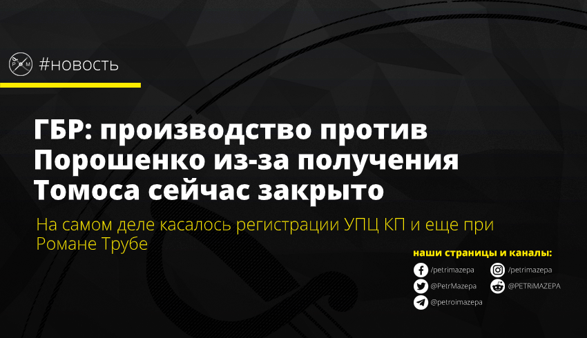 И.о. директора ГБР Александр Соколов сообщил, что уголовное производство против пятого президента Петра Порошенко из-за получения Томоса об автокефалии закрыто. При этом, он отметил, что вопрос получения Томоса не рассматривался, а производство касалось отмены регистрации Украинской православной церкви КП.
