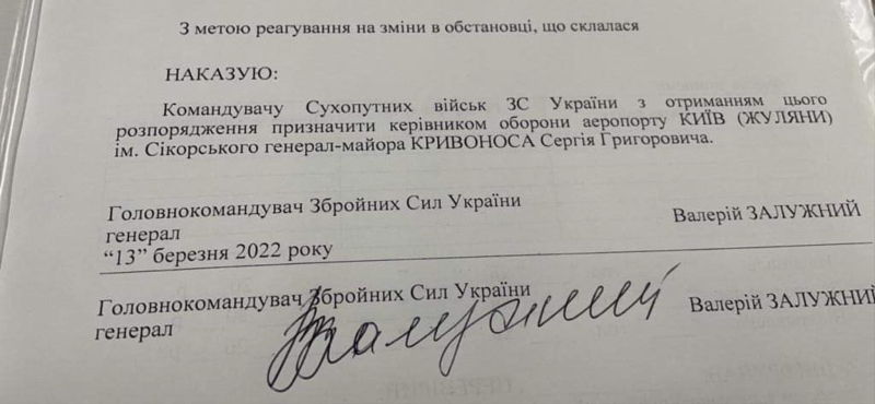 «25 февраля, сразу после нападения, я сделал вывод, что противник после Гостомеля может выбросить десант непосредственно на Киев, в аэропорт Жуляны, и выехал туда ознакомиться с обстановкой. Я увидел, что в Жулянах на тот момент отсутствовали какие-либо руководители, я позвонил оттуда главнокомандующему ВСУ Залужному, сообщил обстановку, и получил устный приказ взять под командование оборону аэропорта. По приказу Залужного мне направили партию пулеметов 12,7 мм и 7,62 мм, а также зенитные установки 23 мм, но это было уже в начале марта. Я объединил все подразделения, в большинстве из необстрелянных людей — пограничников, срочников из президентского полка, нацгвардейцев-добровольцев, ветеранов морской пехоты, собратьев из ДУКа и курсантов Военного института университета Шевченко, и принял меры по обстановке, которые считал необходимыми принять срочно. Взлетная полоса была залита машинной смазкой и перегорожена техникой, все объекты и периметр были подготовлены к противодесатной обороне, наладил подготовку личного состава и проводил учебные стрельбы, чтобы встретить русское наступление. Там был сначала полный хаос, но мы быстро создали организацию. Все мои действия были подтверждены руководством ВСУ, а 12 марта Залужный подтвердил мои полномочия личным приказом. 13 марта меня снова зачислили на военную службу», — рассказал он.