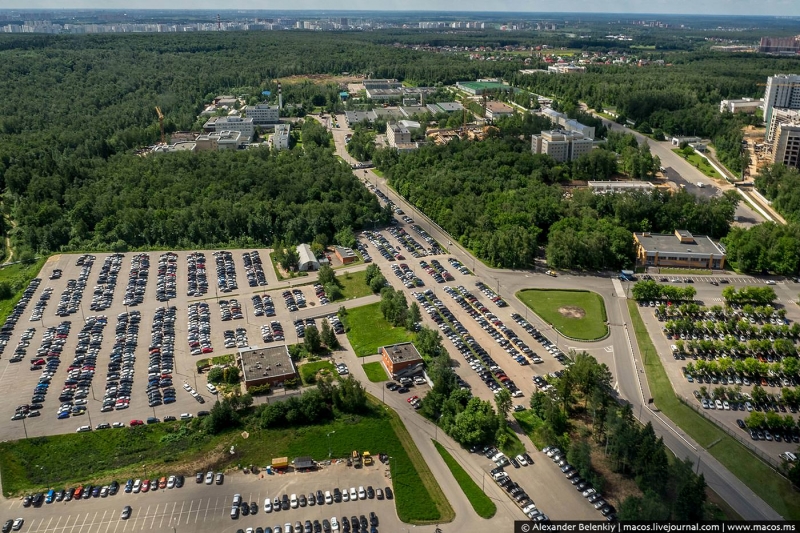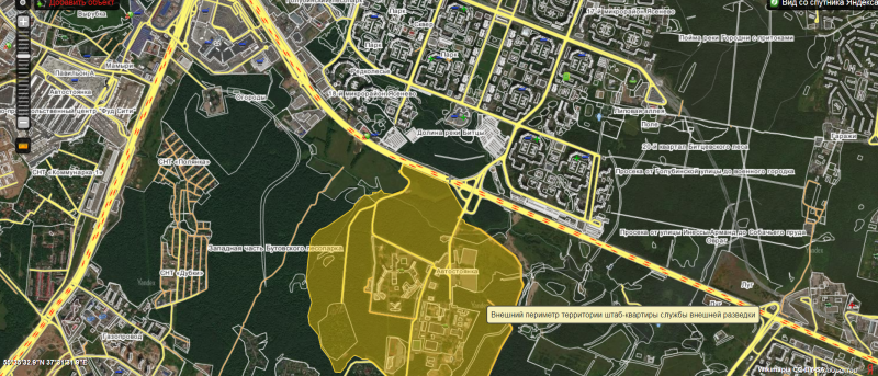 «Самое секретное место Москвы. Штаб-квартира Службы внешней разведки. С земли его не увидеть, всё окружено глухим забором и непроходимым лесом. А тут вон какая интересная архитектура. СВР ширится и растёт, на территории идёт стройка двух больших зданий. Парковка для сотрудников. Я и не знал, что у нас столько разведчиков».