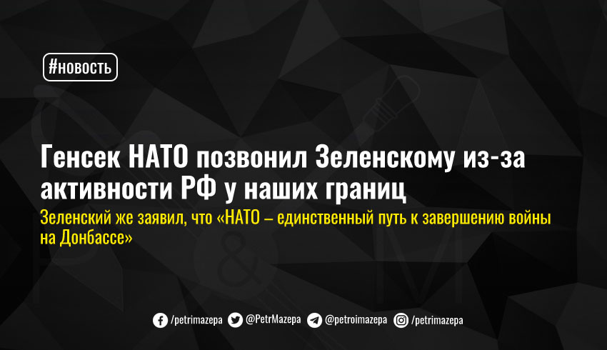 Генеральный секретарь НАТО Йенс Столтенберг позвонил президенту Украины Владимиру Зеленскому из-за активности войск РФ у нашей границы. Президент Зеленский в разговоре снова поднял вопрос получения для Украины Плана действий касательно членства в Альянсе, и назвал НАТО единственным путем к завершению войны на Донбассе.