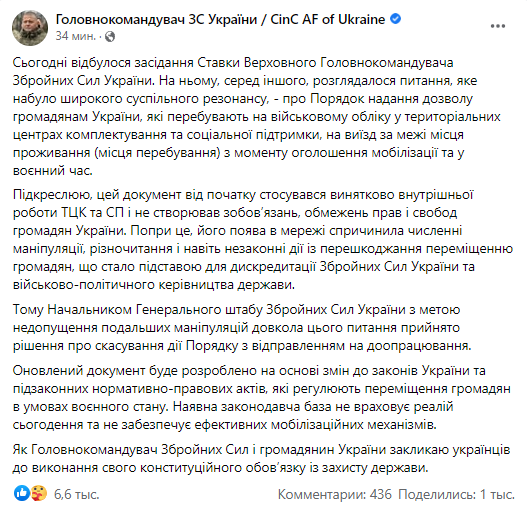 «Подчеркиваю, этот документ с самого начала касался исключительно внутренней работы ТЦК и СП и не создавал обязательств, ограничений прав и свобод граждан Украины. Несмотря на это, его появление в сети спровоцировало многочисленные манипуляции, разночтения, и даже незаконные действия по препятствованию перемещению граждан, что стало основанием для дискредитации Вооруженных сил Украины и военно-политического руководства страны. Поэтому Начальником Генерального штаба Вооруженных сил Украины с целью недопущения дальнейших манипуляций вокруг этого вопроса принято решение об отмене действия Порядка с отправкой на доработку», — написал Залужный в Facebook.