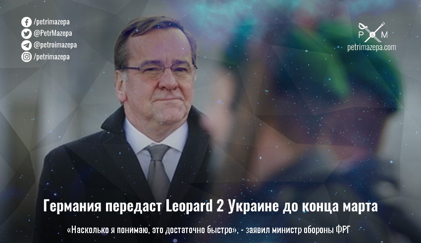 По оценкам министра обороны ФРГ Бориса Писториуса, Германия передаст танки Leopard 2 Украине в конце марта.