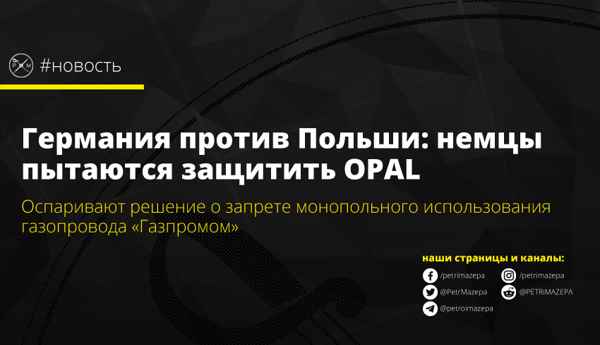 Германия обжаловала решение суда ЕС по газопроводу OPAL, который является внутренним газопроводом системы «Северный поток». Этот газопровод соединяет морскую часть первого «Северного потока» с Германией. Польша считает, что полное использование газопровода одной компанией ставит под угрозу энергетическую безопасность ЕС.
