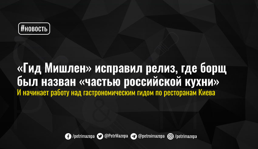 Инспекторы международного гида по ресторанам «Гид Мишлен» исправили свой пресс-релиз, в котором ранее украинский борщ назвали «частью российской кухни», и начинают работу над гастрономическим гидом по киевским ресторанам.