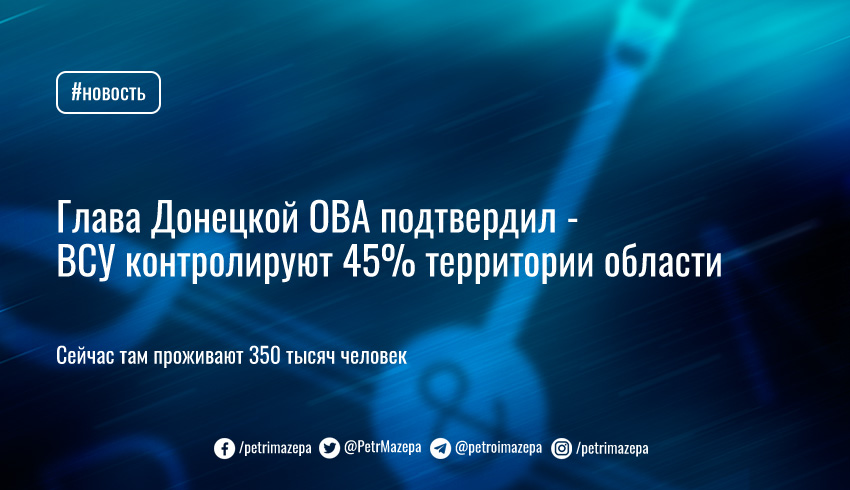 Глава Донецкой областной военной администрации Павел Кириленко подтвердил, что ВСУ контролируют 45% территорий Донецкой области. Сейчас там проживают около 350 тысяч человек.