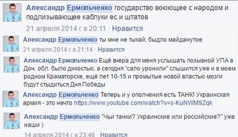 В частности, на «миротворце» есть скрины с краматорских групп, на которых Ермольченко радуется сбитому украинскому вертолету, обвиняет во всем Майдан и называл боевиков «нашими пацанами».