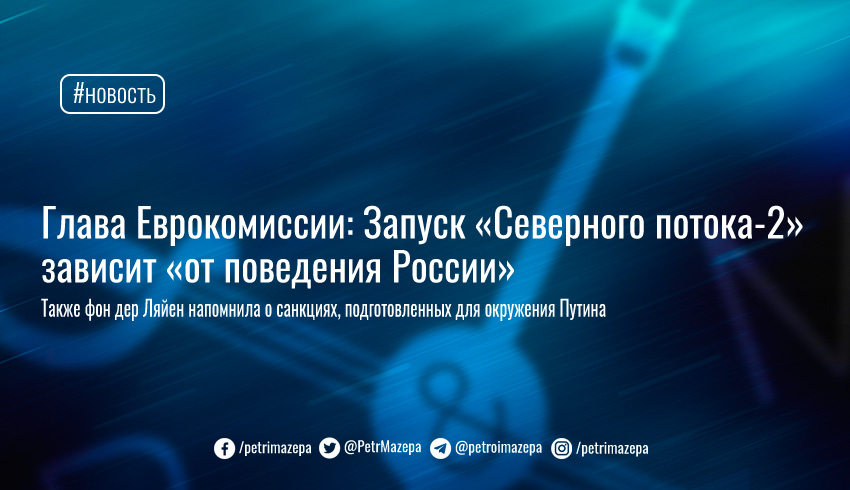 Спорный газопровод «Северный поток — 2» по Балтийскому морю также был частью пакета санкций. Сможет ли трубопровод быть введен в эксплуатацию, зависит «от поведения России», сказала фон дер Ляйен.