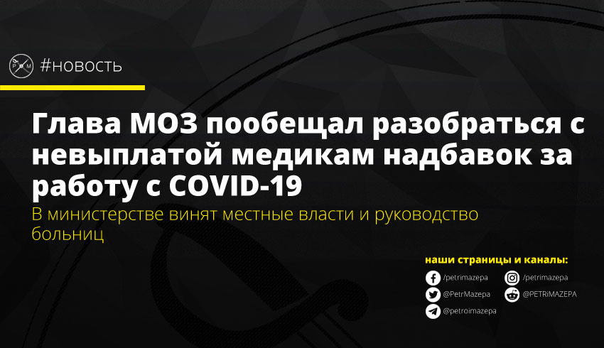 Глава МОЗ Максим Степанов заявил, что вопрос с невыплатой медикам обещанных надбавок в 300% будет скорее всего решен в ближайшее время. Он уточнил, что Министерство перечислило в города все средства, которые должны быть выплачены за март медицинским работникам, которые лечат больных с COVID-19, назвал виновными в невыплатах местные власти и руководство больниц, и потребовал от глав ОГА чтобы они отчитались по каждому медицинскому учреждению.