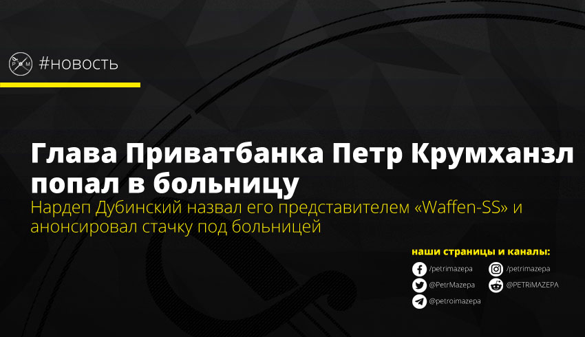 Глава Приватбанка Петр Крумханзл был госпитализирован, состояние его здоровья не вызывает беспокойства. Однако нардеп Александр Дубинский от «Слуги народа» заявил, что глава Приватбанка находится в реанимации, вспомнил тосты и пожелания олигарха Игоря Коломойского, а также заявил, что Никопольский завод ферросплавов может «послать рабочих» под больницу, и поставить Приватбанку ультиматум.