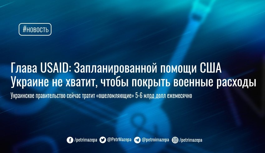 Глава Агентства США по международному развитию Саманта Пауэр в ток-шоу The Way Forward рассказала, что, по подсчетам USAID, украинское правительство сейчас тратит «ошеломляющие» 5-6 млрд долл. ежемесячно на то, чтобы удержать страну под ударом россиян.