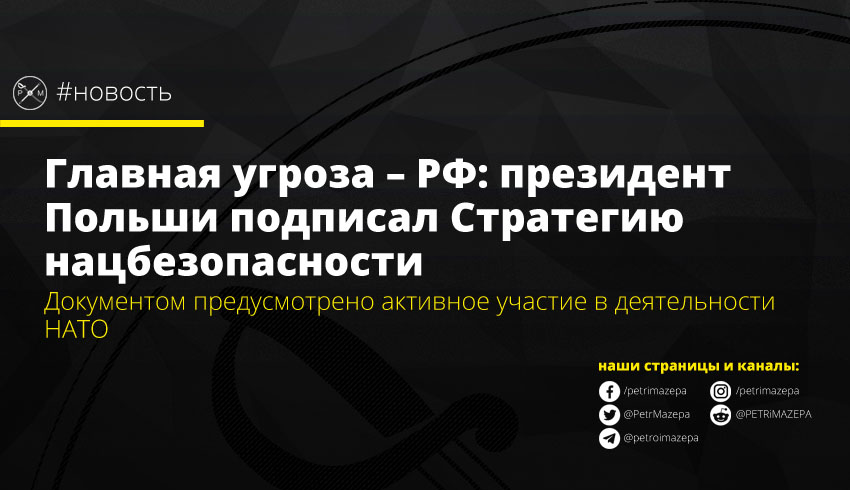 Президент Польши Анджей Дуда подписал Стратегию национальной безопасности. Основной угрозой в документе названа агрессивная политика России, противостоять которой Польша намерена, принимая активное участие в деятельности НАТО.