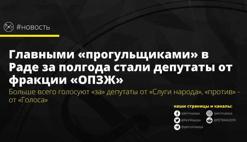 В «Опоре» также сообщили, что за полгода работы парламента девятого созыва наибольшее количество голосований пропустили депутаты от фракций ОПЗЖ, «Батьківщина», «Слуга народа» и внефракционные.