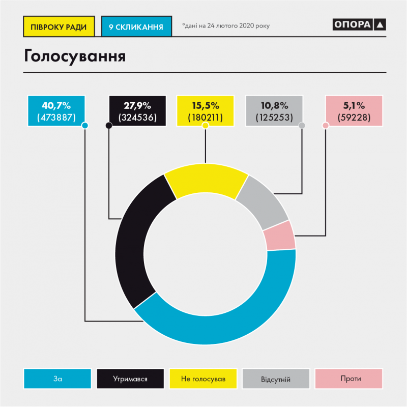 Согласно принятым в октябре изменениям в законодательство, посещаемость пленарных заседаний измеряется участием нардепов в голосованиях. В «Опоре» подсчитали, что за первые полгода работы парламента депутаты более 1,1 млн раз нажали на кнопки. В 40,7% случаев депутаты голосовали «за», в 27,9% – удерживались, в 5,1% – «против». В 15,5% случаев депутаты не голосовали, в 10,8% – отсутствовали.