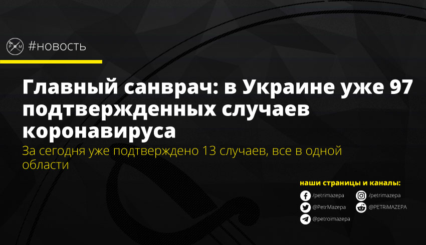 Главный санврач Украины Виктор Ляшко заявил что количество подтвержденных случаев заражения коронавирусом выросло до 97 с 84, которые насчитывались по состоянию на 10:00 сегодняшнего дня.