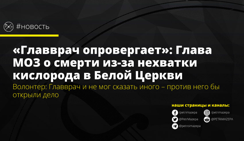 Глава МОЗ Максим Степанов заявил, что в больнице опровергли данные о смерти больного COVID-19, который по данным волонтера отдал выделенные ему 15 минут кислорода также госпитализированному сыну. Волонтер Яровая, ранее сообщившая об этой истории, подчеркивает, что маловероятно чтобы главврач, источник информации министра, подтвердил бы данные и тем самым дал повод открыть против себя уголовное дело.