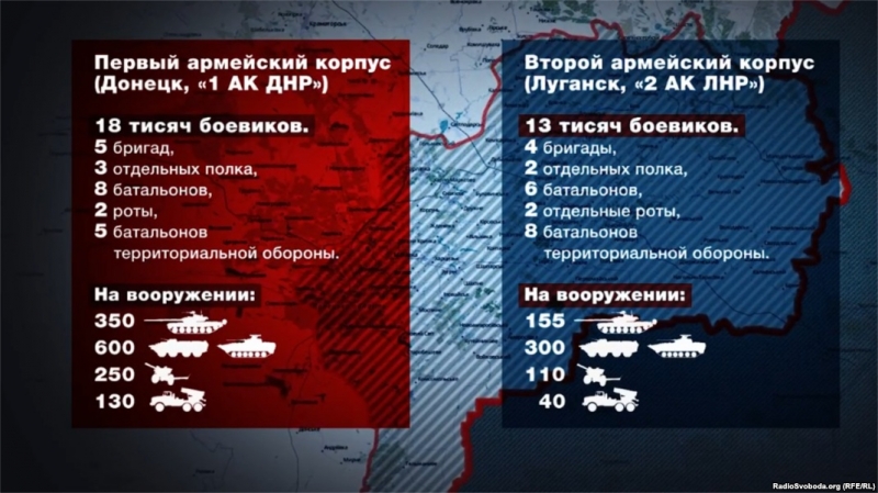 А в українському Міноборони навіть так звані 1-й і 2-й армійські корпуси угруповань «ДНР» і «ЛНР» називають частиною структури Південного військового округу Російської Федерації. Близько тридцяти п’яти тисяч бойовиків, за даними ГУР, підпорядковуються 8-й армії Росії.