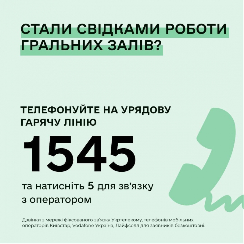 Об этом он сообщил в своем Telegram-канале. Для того, чтоб сообщить о нарушении стоит набрать номер 1545, после чего нажать цифру 5 для связи с оператором. Сам Гончарук пообещал, что правительство на данные жалобы будет реагировать оперативно. Не забыл премьер напомнить и о том, что за один день по всей территории Украины были закрыты более 5300 игорных залов.