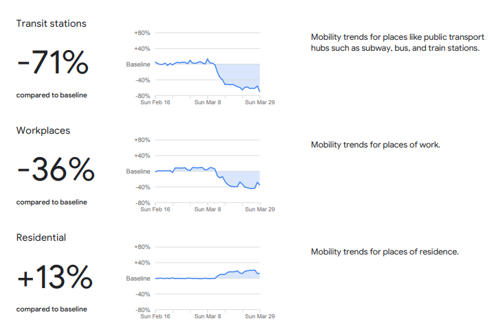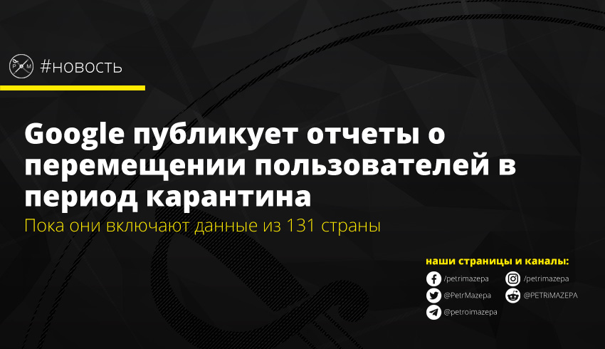 Google начал публиковать отчеты о мобильности своих пользователей. Речь идет об информации касающейся изменения перемещений граждан в магазинах, аптеках, парках, торговых и развлекательных заведениях, общественном транспорте и других традиционных местах скопления людей.