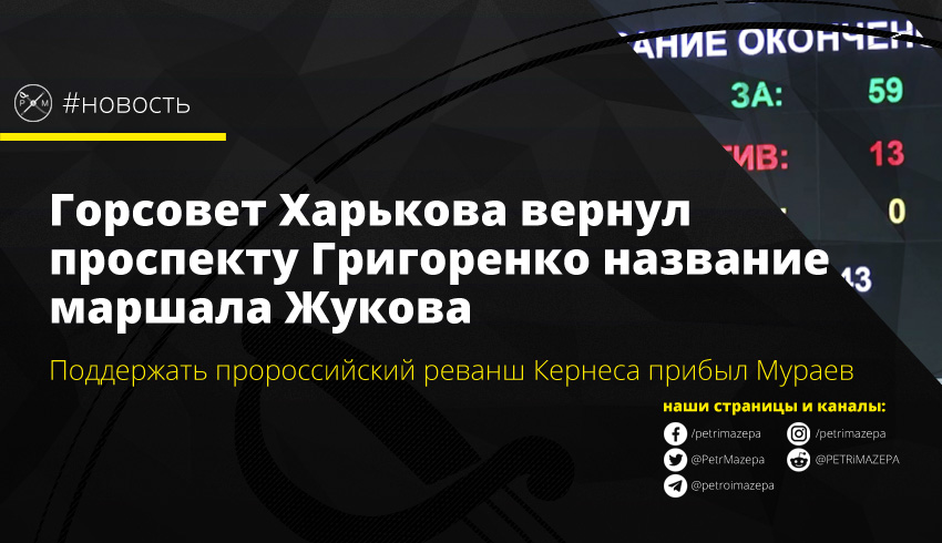 Харьковский горсовет 19 июня принял решение о переименовании проспекта Петра Григоренко обратно в «маршала Жукова». За это решение проголосовали 59 депутатов из 73 зарегистрировавшихся. Прибыль рассказать о «подвигах Жукова» и нардеп Евгений Мураев, а харьковские активисты обвинили Кернеса в том, что им не дали зарегистрировать петицию против переименования.