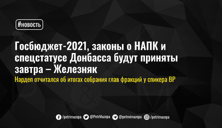 Госбюджет-2021, законы о НАПК и спецстатусе Донбасса будут приняты завтра – Железняк