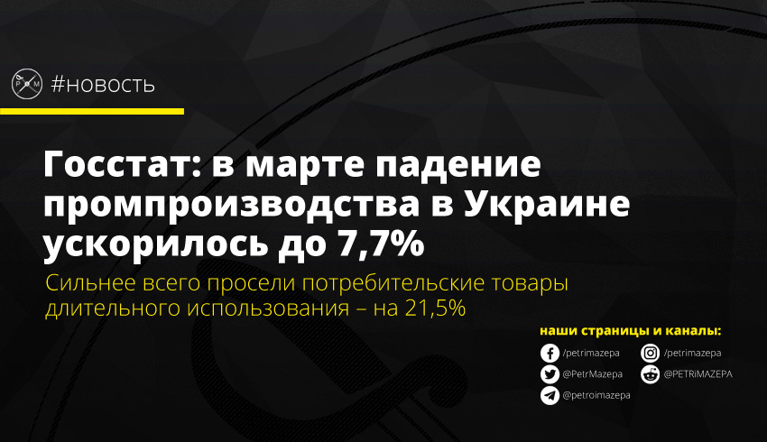 Госстат: в марте падение промпроизводства в Украине ускорилось до 7,7%