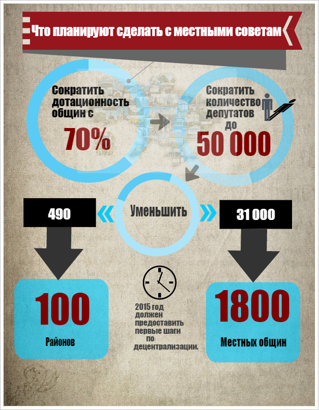 Замысел властей заключается в том, чтобы сбросить со своих плеч дополнительное бремя местных бюджетов. В правительстве уверяют, что минимизация фискального и управленческого давления центра будут стимулировать регионы к экономической активности и, соответственно, росту поступлений в местные бюджеты. По подсчетам чиновников КМУ рост ресурса местных бюджетов в 2015 году составит более 30 млрд. грн. Также планируется предусмотреть упрощение процедуры предоставления местных гарантий и осуществление заимствований от международных финансовых организаций. По сути, расчёт делается на инициативность и изворотливость местных чиновников. Вот только найдется ли среди их числа достаточно «великих комбинаторов», способных придумать, как Васюки превратить в Нью-Москву…